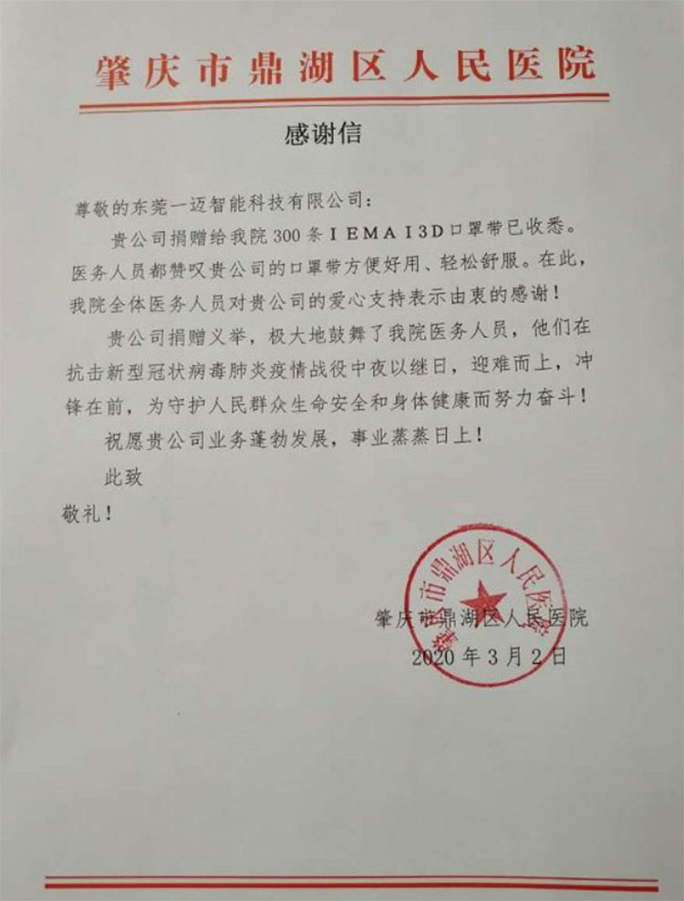 On February 29, IEMAI 3D packed 300 mask connection straps and sent them to the People’s Hospital of Dinghu District, Zhaoqing City by express delivery.
